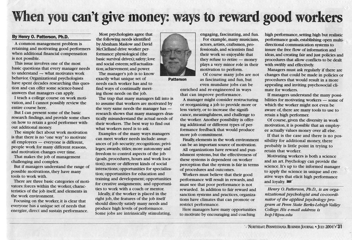 Home » Psychology in the Workplace: NEPA Business Journal Articles » # 11 – July 04 – When you can’t give money: ways to reward good workers