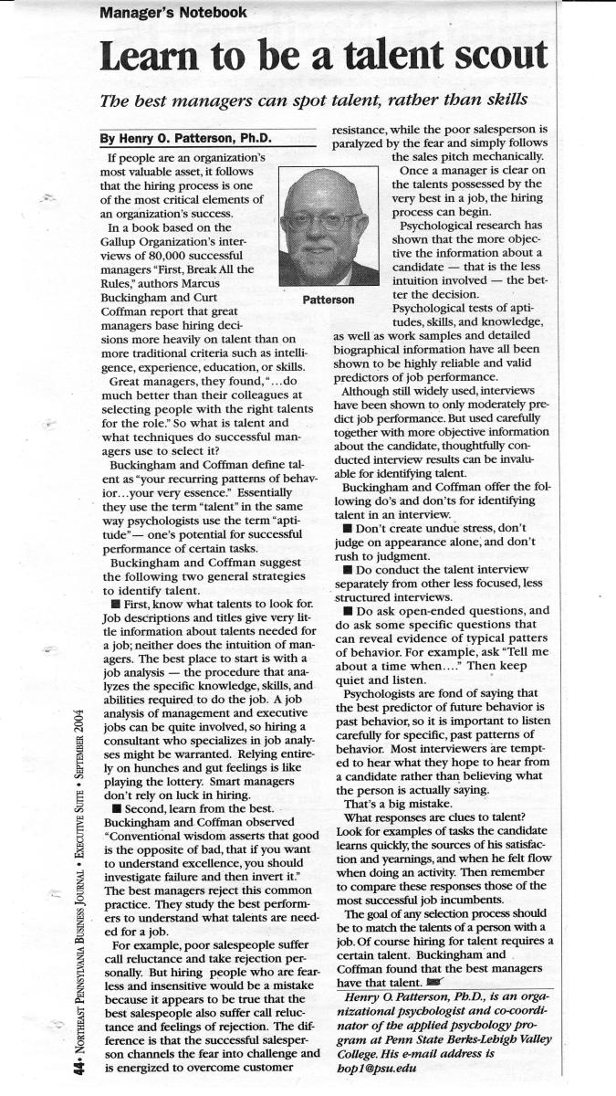 Home » Psychology in the Workplace: NEPA Business Journal Articles » # 12 – Sept 04 – Learn to be a talent scout