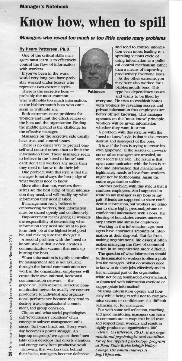 Home » Psychology in the Workplace: NEPA Business Journal Articles » # 13 – Nov 04 – Know how, when to spill