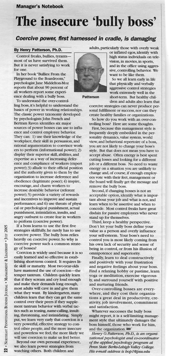 Home » Psychology in the Workplace: NEPA Business Journal Articles » # 17 – July 05 – The insecure ‘bully boss’