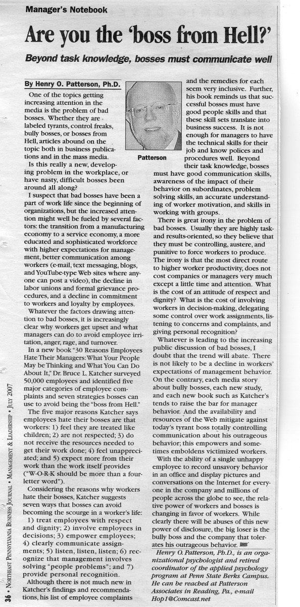 Home » Psychology in the Workplace: NEPA Business Journal Articles » # 29 – July 07 – Are you the ‘boss from Hell?’