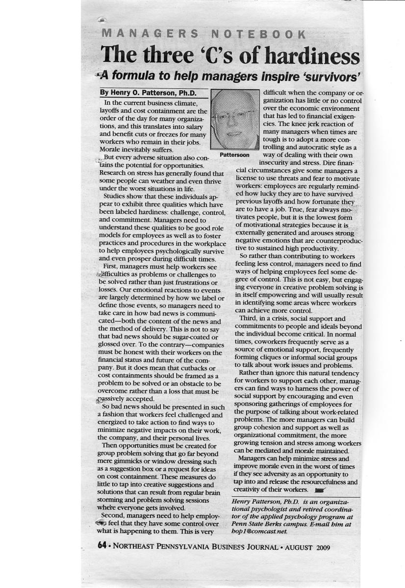 Home » Psychology in the Workplace: NEPA Business Journal Articles » # 40 – Aug 09 – The three ‘C’s of hardiness