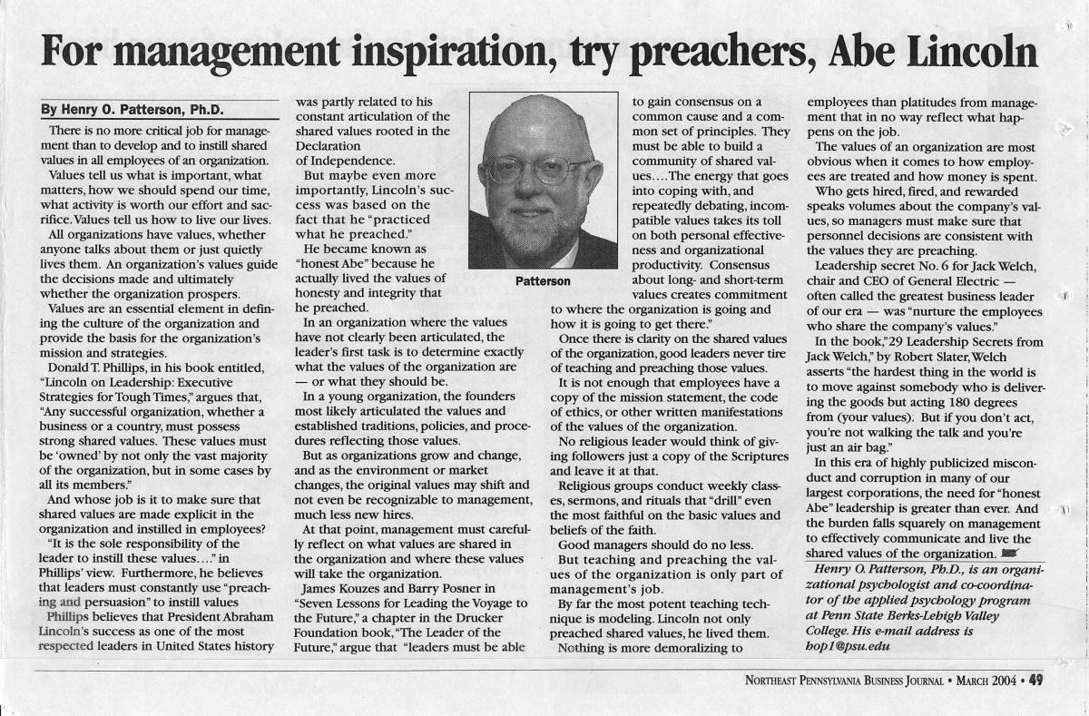 Home » Psychology in the Workplace: NEPA Business Journal Articles » # 9 – Mar 04 – For management inspiration, try preachers, Abe Lincoln